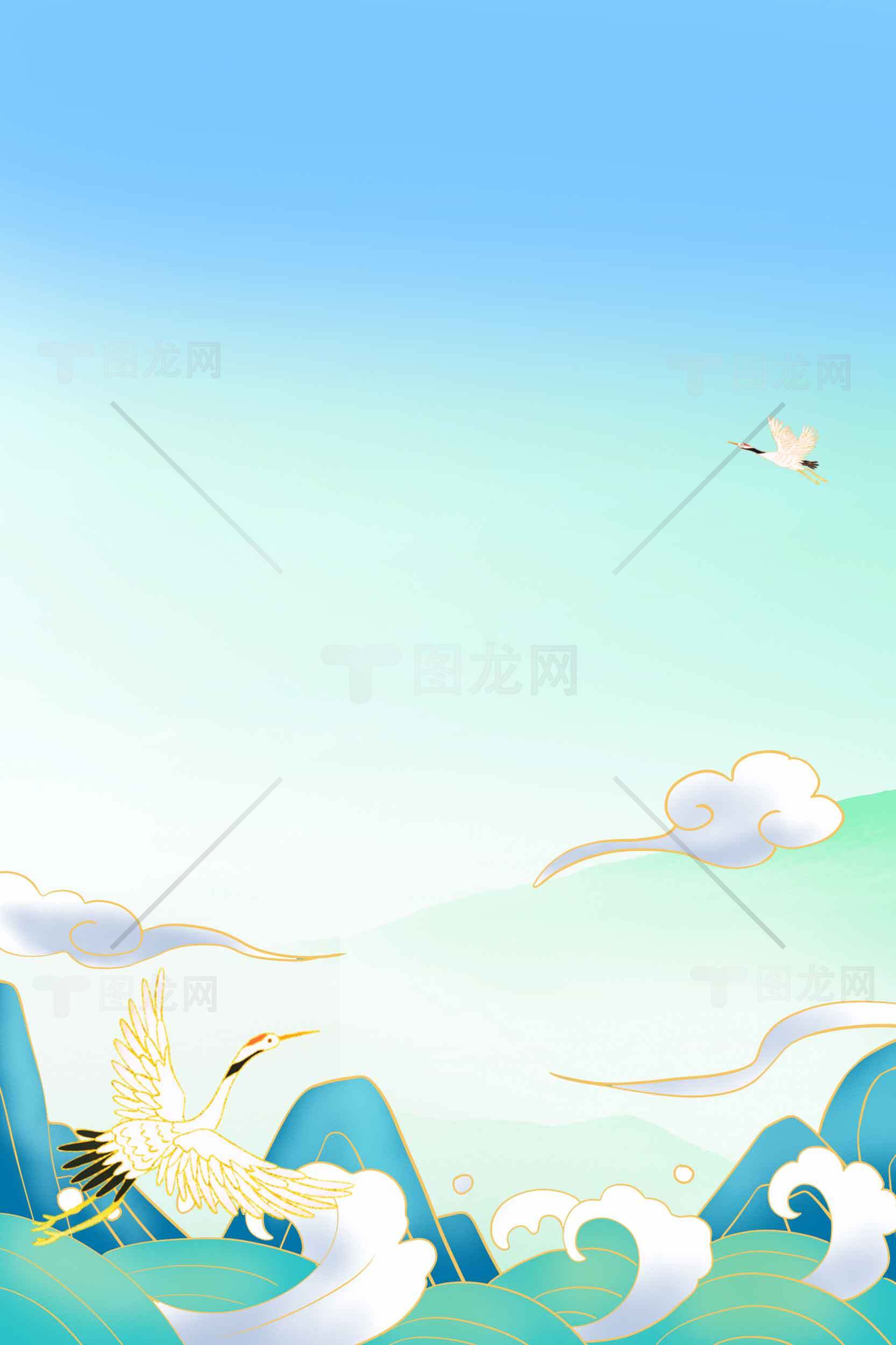 国风山水背景图:青绿主色调与仙鹤元素